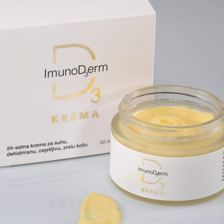 ImunoD3erm krema za lice, vrat i dekolte, prava je riznica kvalitetnih sastojaka poput hladno prešanih ulja argana i koštica marelice, CO2 pulpe pasjeg trna, D vitamina, hijaluronske kiseline, ceramida, kolagena, elastina i hidrolata bušina.