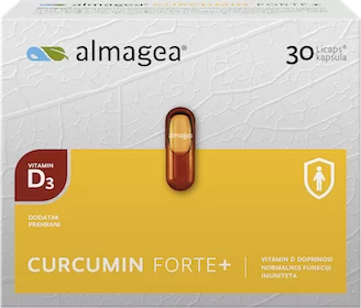 Almagea Curcumin Forte+ je dodatak prehrani s naprednim oblikom kurkumina (NovaSOL® tehnologija) visoke bioraspoloživosti i vitaminom D za podršku imunitetu, zglobovima i općem zdravlju organizma.