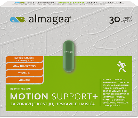 Almagea Motion Support+ je dodatak prehrani s glukozaminom, hondroitinom, MSM-om, kolagenom i vitaminom C za zdravlje zglobova, hrskavice i normalnu pokretljivost.