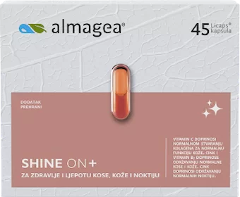 Almagea Shine On+ je dodatak prehrani s biotinom, cinkom, selenom, vitaminima i aminokiselinama za jačanje kose, noktiju i zdrav izgled kože.