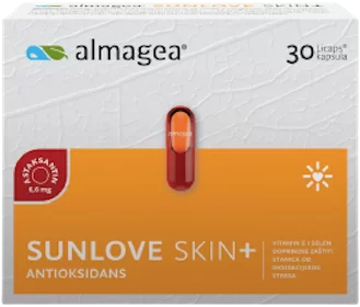 Almagea Sun Love+ je dodatak prehrani s beta-karotenom, likopenom, luteinom, vitaminima i mineralima za pripremu kože na sunce i postizanje zdravog, ujednačenog tena.