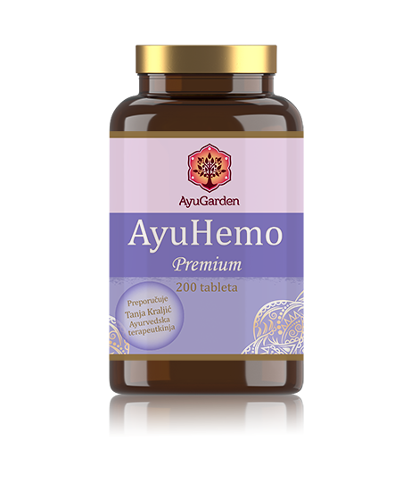 AyuHemo je mješavina probranih ayurvedskih biljaka koje potiču ublažavanje hemoroida. Lubrikativna i laksativna svojstva (Suran, Triphala i Senna) omekšavaju i olakšavaju stolicu i konstipaciju. Antioksidativna i hemostatska svojstva (Nagkeshar) pomažu u smanjenju prekomjernog krvarenja. Protuupalna svojstva mogu kontrolirati oticanje hemoroida.