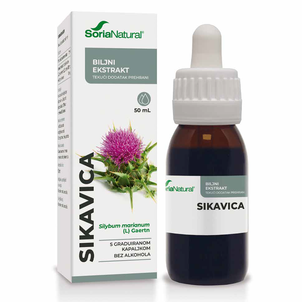 Tekući dodatak prehrani s fluidnim ekstraktom sjemenki sikavice (Silybum marianum Gaertn) u biljnom glicerolu.